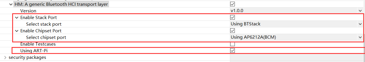 首先需要参考文档教程搭建 ART-Pi 蓝牙开发的最小环境,然后选中并配置 HM 软件包: