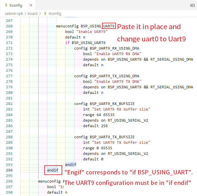 Open the board\kconfig file in the BSP and add the UART9 configuration.