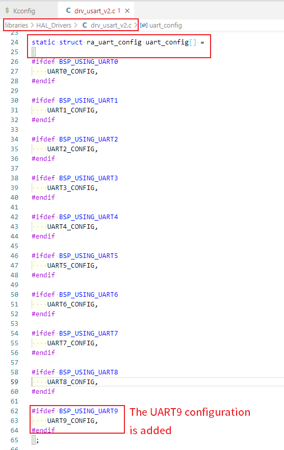 Open the file libraries\HAL_Drivers\config\ra6m4\uart_config.h to add the UART9 configuration.
