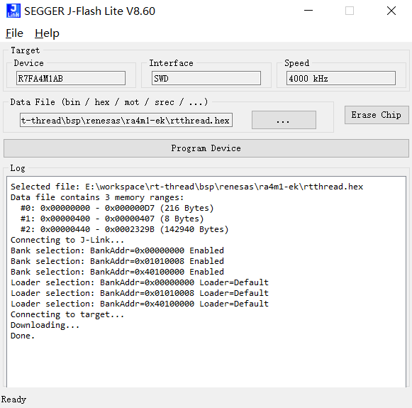 menuconfig命令配置工程,配置好之后保存退出。pkgs --update命令更新软件包。scons 命令即可编译工程。打开 J-Flash lite 工具,选择芯片型号 R7FA4M1AB,点击 OK 进入工具。选择 BSP 目录下 编译出的 rtthread.hex 文件,点击 Program Device 按钮开始烧录。具体操作过程可参考下图步骤: