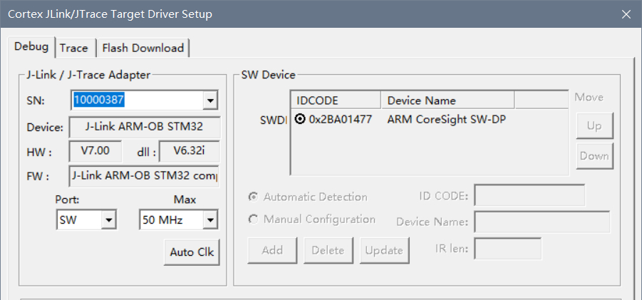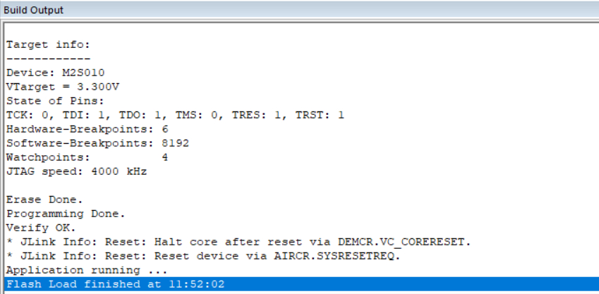 为了能使用 ARM 调试器连接到 ARM 内核,而不是 FPGA,需要把 JTAG_SEL 引脚置为低电平。使用 ARM 调试器,如 JLink,对应连接 JTAG 口的 TMS、TCK、GND 引脚,如果连接正常,可以检测到 ARM 芯片,如下图所示: