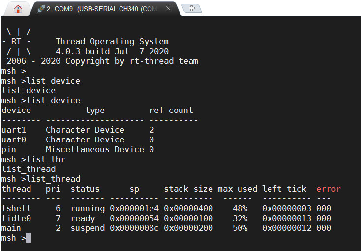 移植了 RT-Thread 内核,支持线程调度、线程间同步和通信等,目前已经完成了PIN、Serial设备驱动,FinSH组件默认使用uart0设备。