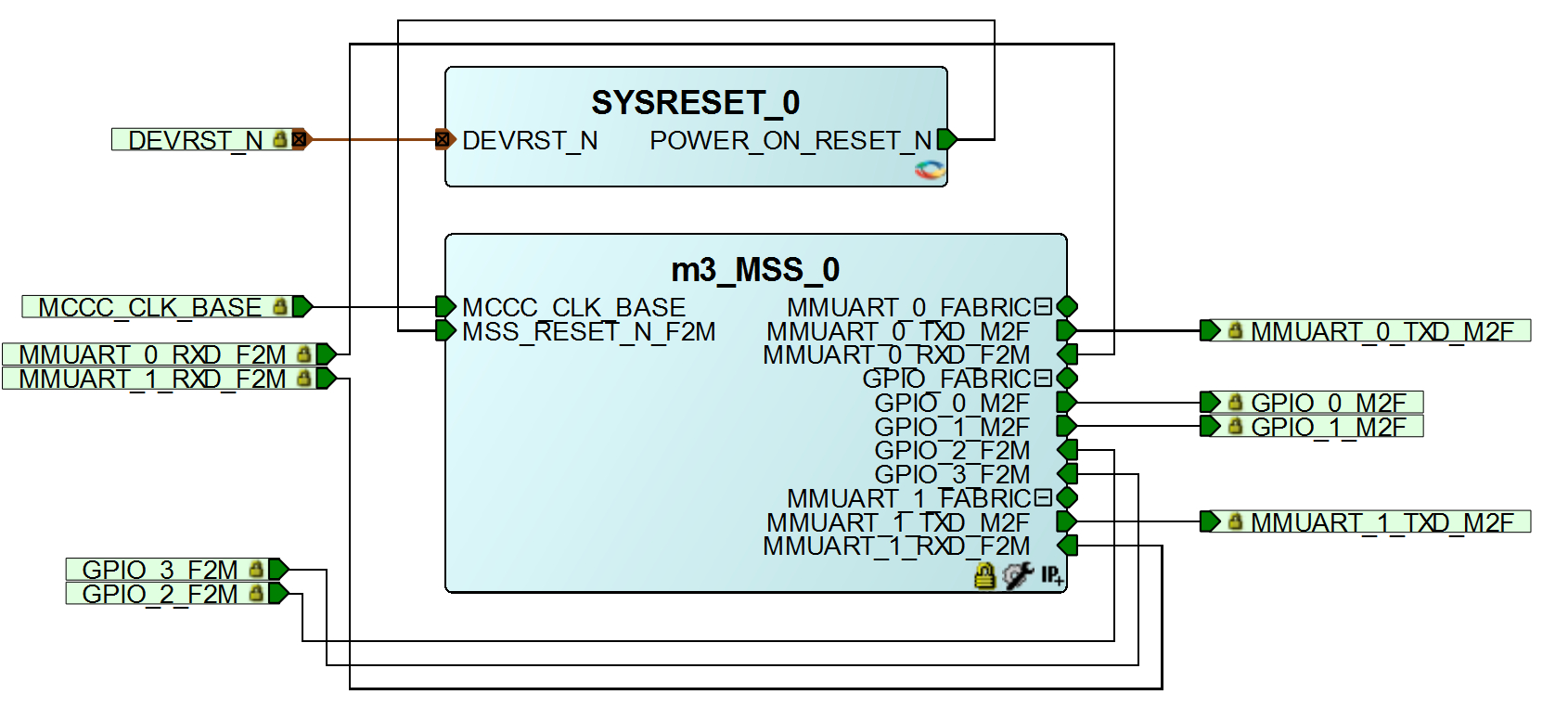 MSS 部分仅使用到了GPIO 和UART,GPIO_0配置成输出输出模式用于驱动LED。