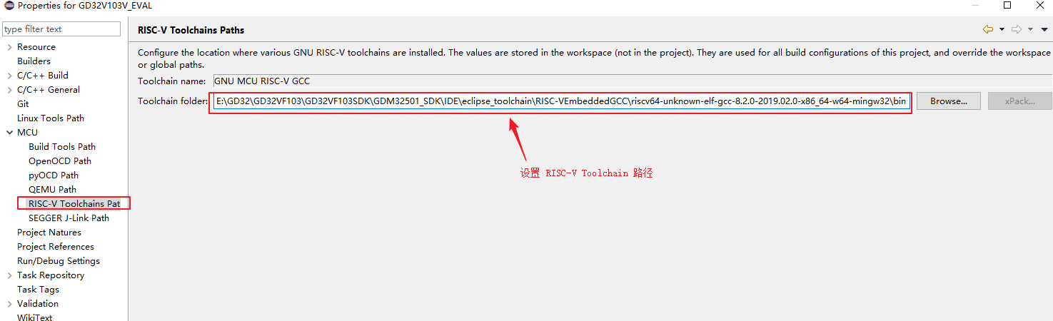 点击 MCU 列表中的 RISC-V Toolchains Paths 选项,为其选择 SDK 文件包中提供的对应工具。