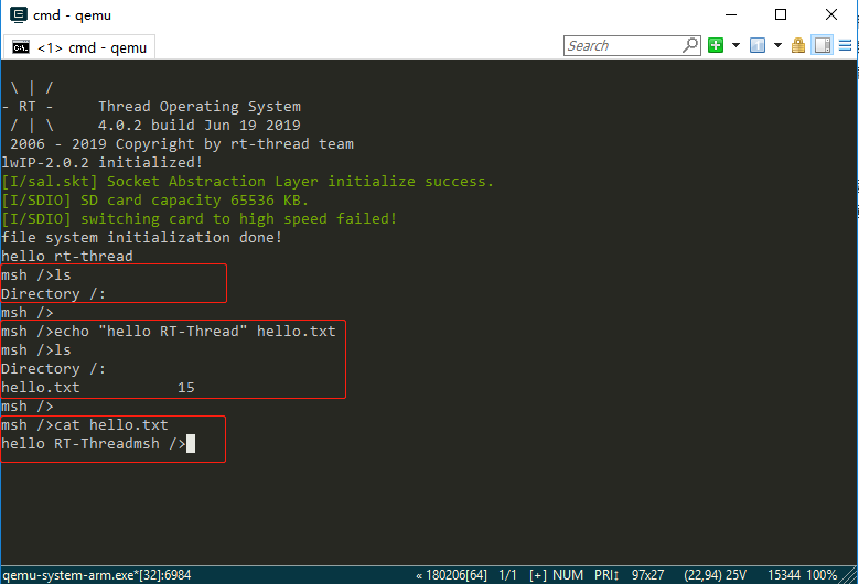 The file system will not be loaded immediately after the first formatting of the SD card, and the file system will be loaded correctly only after the second boot. So exit the virtual machine, and then restart the virtual machine and project by entering qemu.bat on the Env command line interface. Entering ls command, you can see that the Directory directory has been added, the file system has been loaded, and then you can experience the file system with other commands provided by RT-Thread: