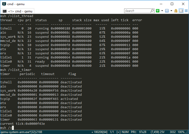 For example, by entering the list_thread command, you can see the currently running threads, thread status and stack size; by entering the list_timer, you can see the status of the timers.