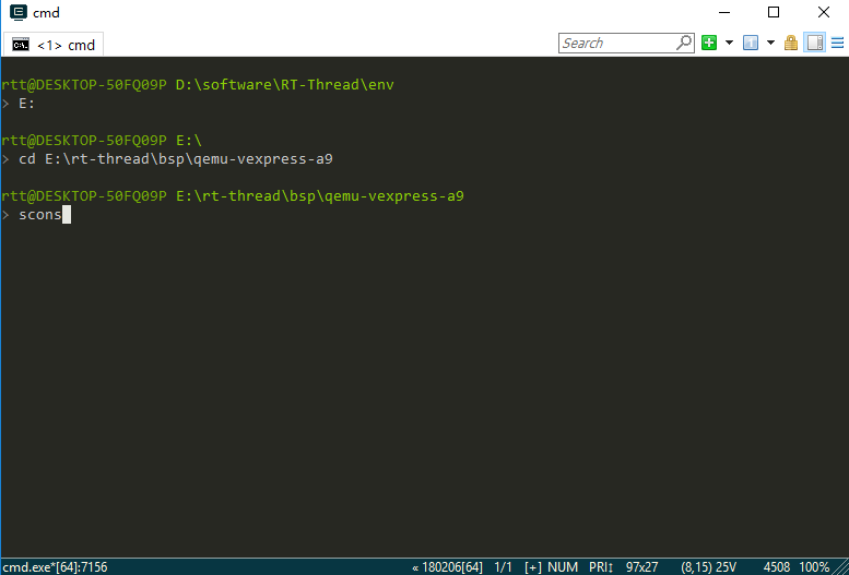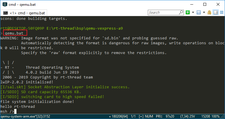 Switch to the QEMU BSP directory and enter the scons command to compile the project. If the compilation is correct, the rtthread.elf file will be generated in the BSP directory, which is a target file required for QEMU to run.