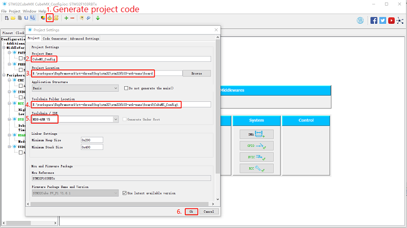 The new BSP framework also introduces the CubeMX tool, which can be used to configure the peripheral pins which are used in the BSP. The CubeMX tool provides a graphical configuration interface. This graphical configuration method is more intuitive for developers. It not only allows developers to flexibly configure the resources used in the BSP, but also allows developers to understand the use of resources at a glance .