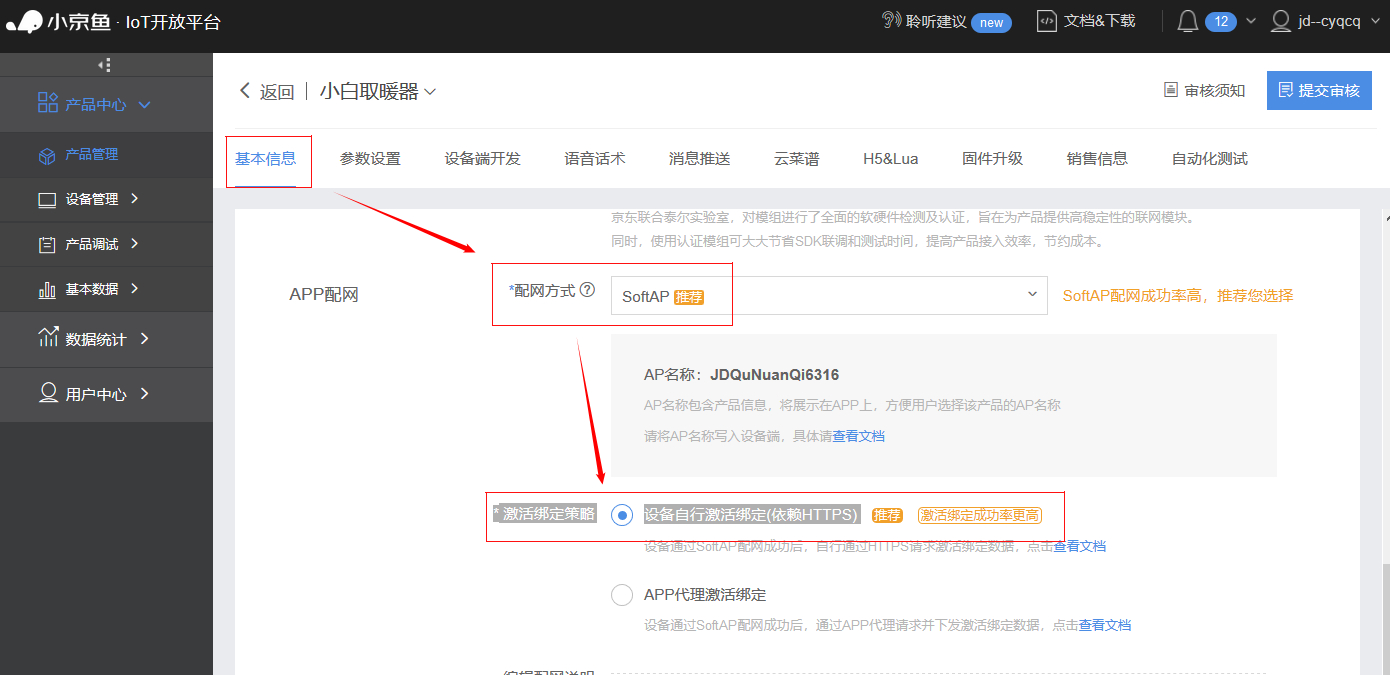 产品管理,基本信息界面,设置配网方式为SoftAP(有些模块不支持该配网方式,这里使用联盛德 W600模块),设置激活绑定策略为设备自行激活;