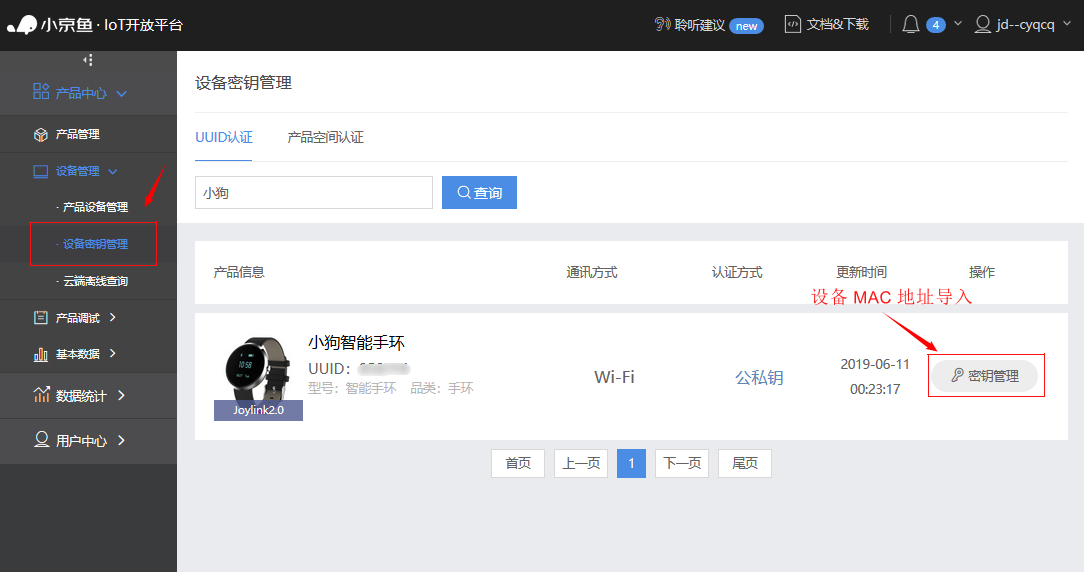 创建产品之后,正常应该是创建新设备,京东云提供 设备密钥管理 机制,通过表格传入的设备 MAC 地址生成该 MAC 地址设备特有的Private Key(设备私钥),用于设备激活认证。