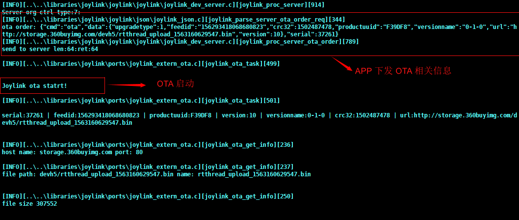 设备端 OTA 文件下载完成, APP 上提示 固件升级成功,待设备重启后即可使用!,重启设备进入 Bootloader 固件更新,固件升级完成。