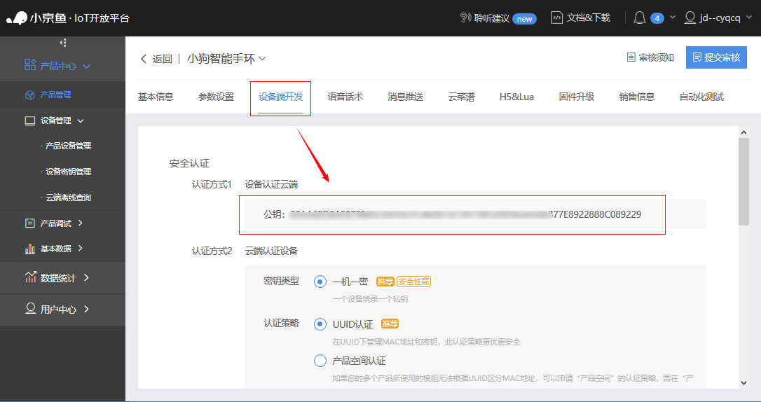 参考官方 创建产品说明 ,创建成功之后需要获取并记录产品 UUID 和 Product Key(公钥),用于后面设备的激活和认证过程。