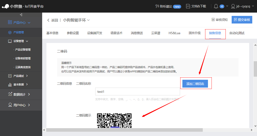 每个设备对应一个二维码,用于设备的联网和激活认证,在 产品管理->销售信息 -> 二维码处生成,如下图所示: