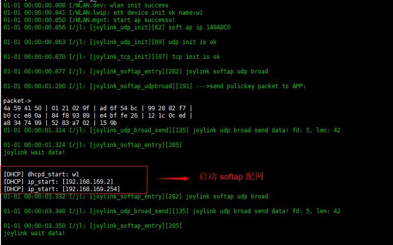 设备第一次上线进入配网模式,默认开启 softap 配网方式,如下图所示:
