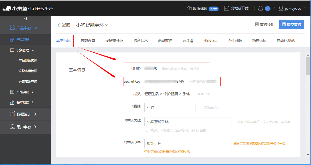 如下图所示为创建产品基本参数,当前创建的产品类型为智能手环: