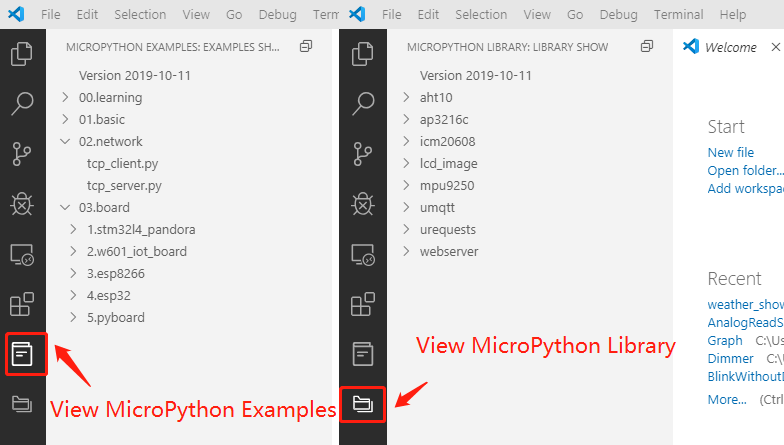 The MicroPython plug-in provides a wealth of sample code and library files to view in the left active bar.