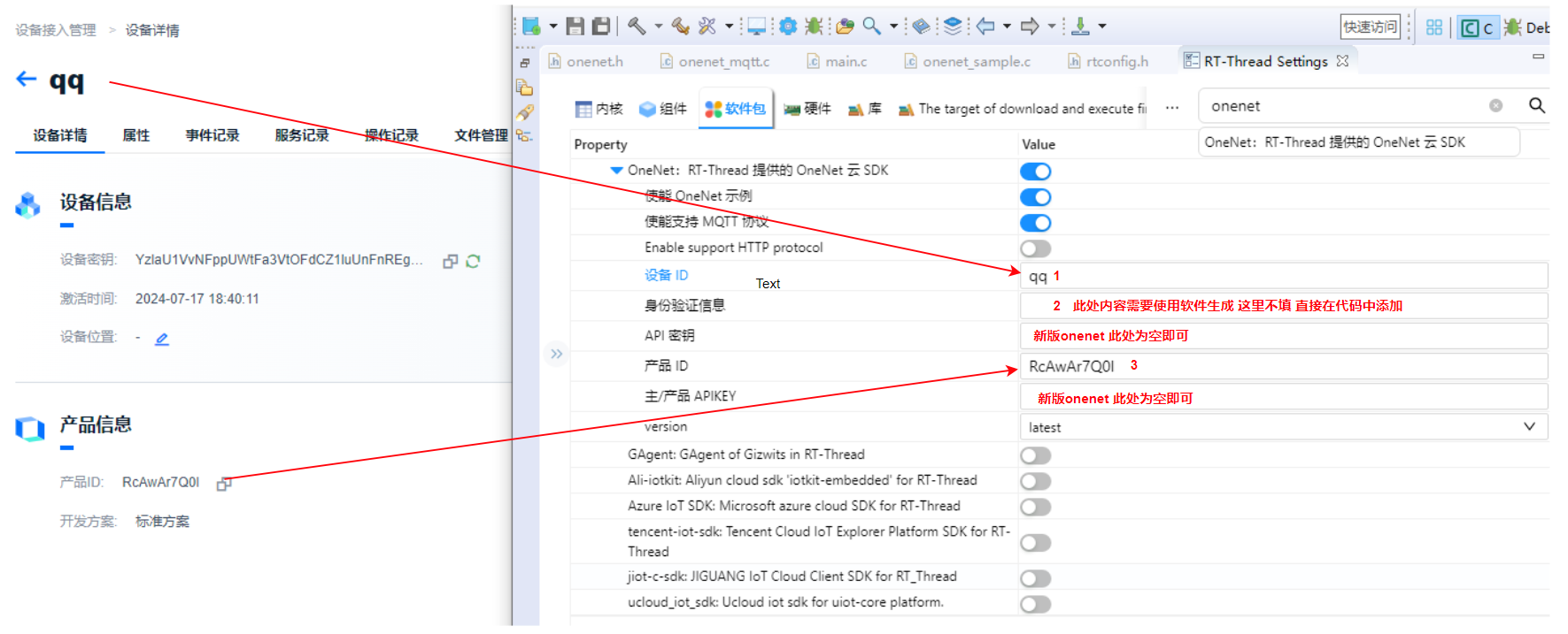 +使用新版onenet平台仅需要填写设备ID,身份验证信息与产品ID。身份验证信息需要使用软件生成,在下文中进行详细的介绍。