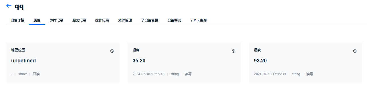 +在onenet的设备管理->属性中可以实时查看上传的数据,显示示例: