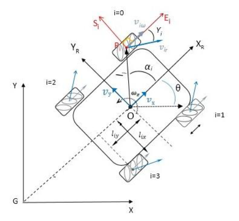 除了全局坐标系外,我们定义了小车的前进方向为 Xr,与前进方向垂直的方向为 Yr,以小车车头逆时针旋转方向为旋转角速度 w 的正方向。