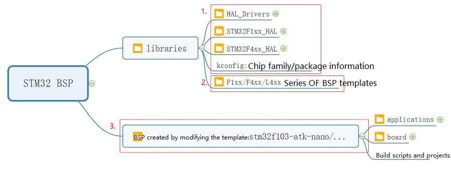 Each BSP of the STM32 series consists of three parts, namely the general library, the BSP template and the specific development board BSP. The following table uses the F1 series BSP as an example to introduce these three parts: