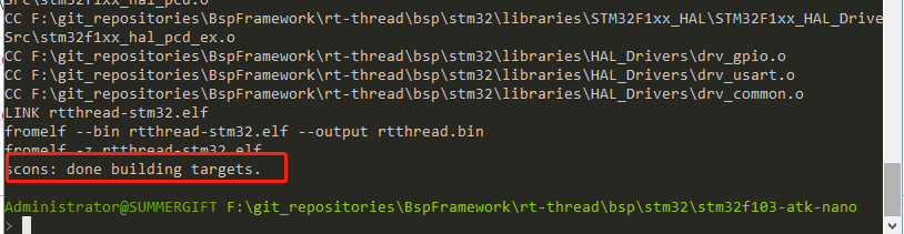 At this point, the new BSP can be used. Next, we can use the commands scons --target=mdk4 and scons --target=iar respectively to update the MDK4 and IAR projects so that the BSP becomes a complete BSP that can be submitted to GitHub (Making MDK4 project is optional).