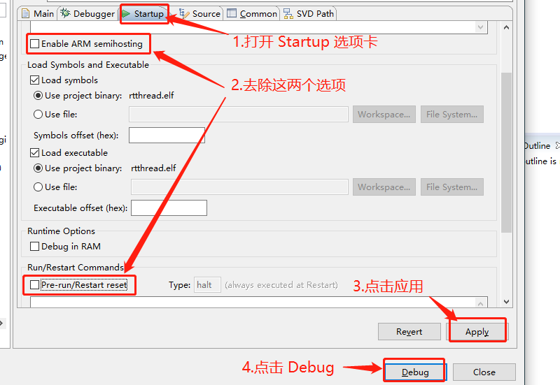 选中生成的 rtthread.elf 文件,右键配置 Debug 参数,如下图所示