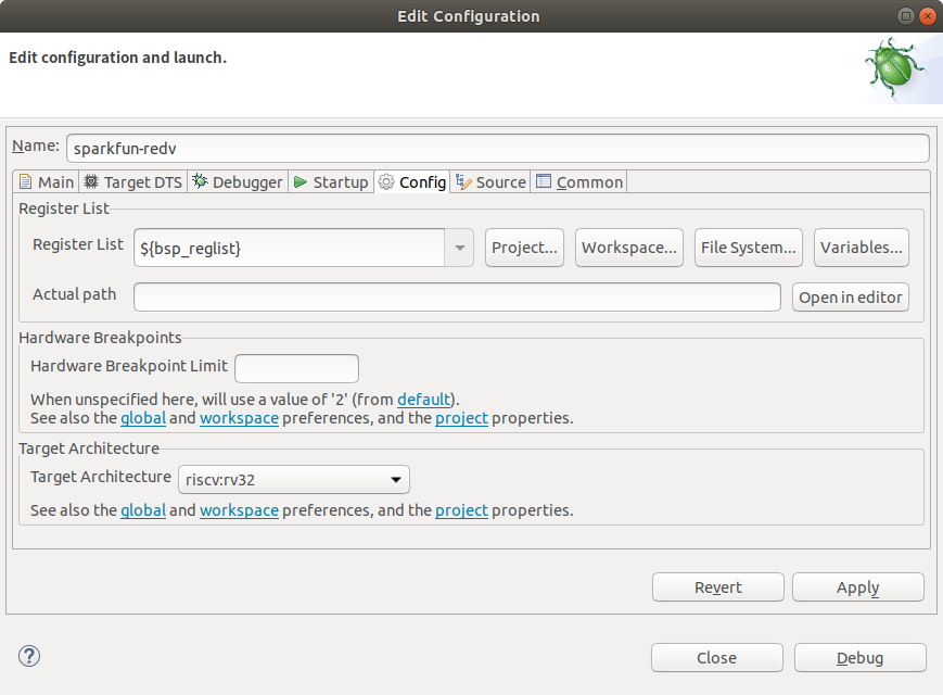 点击 Config 选项卡,在 'Target Architecture' 处选择 'riscv:cv32' ,点击 Debug 开始调试。