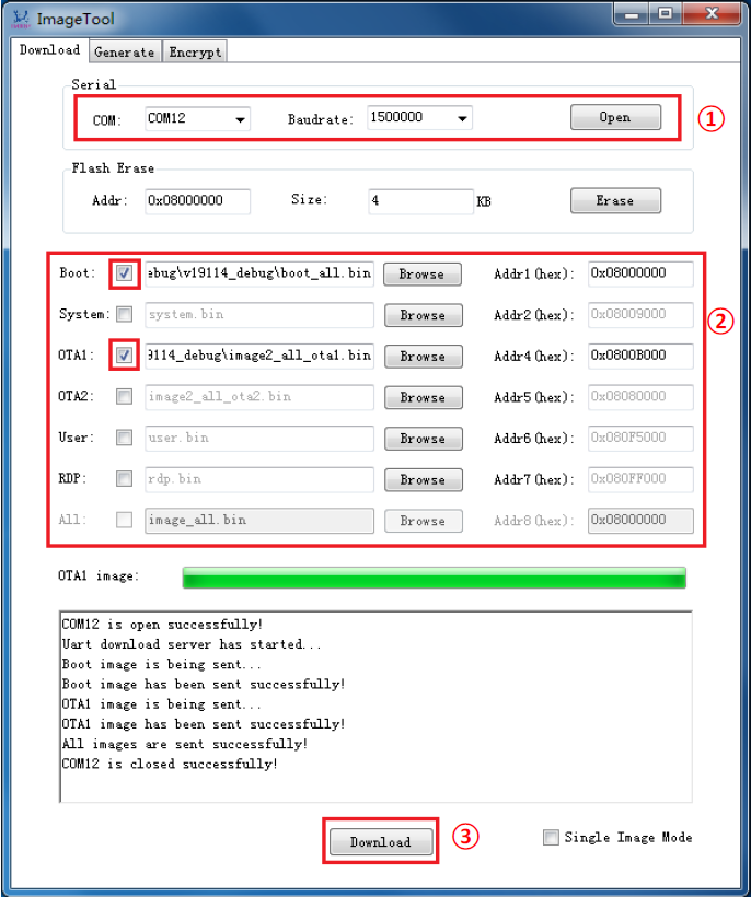 boot选择工程提供的 boot_all.bin, OTA1 选择生成的 image2_all_ota1.bin 文件(通常在工程目录下),并且注意在这两个选项前面打勾确认,其他默认即可,如下载工具图“②”。