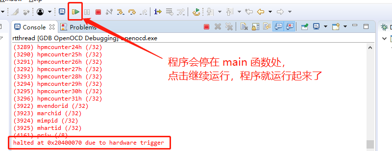 然后待程序停止在 main 函数处,然后点击继续运行程序就运行起来了。