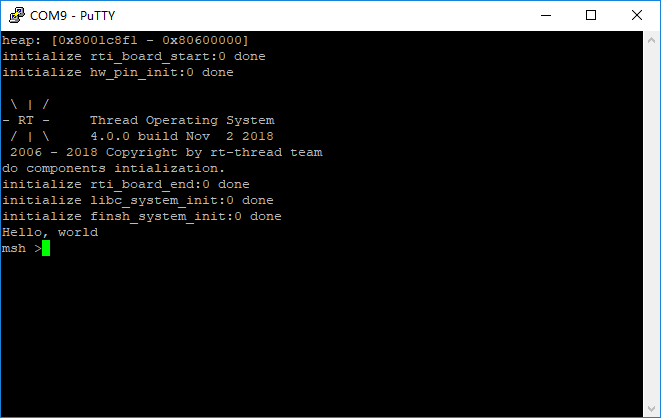 如果编译 & 烧写无误,当复位设备后,会在串口上看到RT-Thread的启动logo信息: