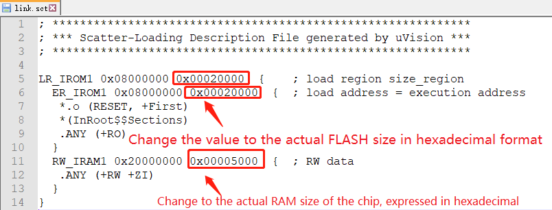 The following uses the link script link.sct used by MDK as an example to demonstrate how to modify the link script: