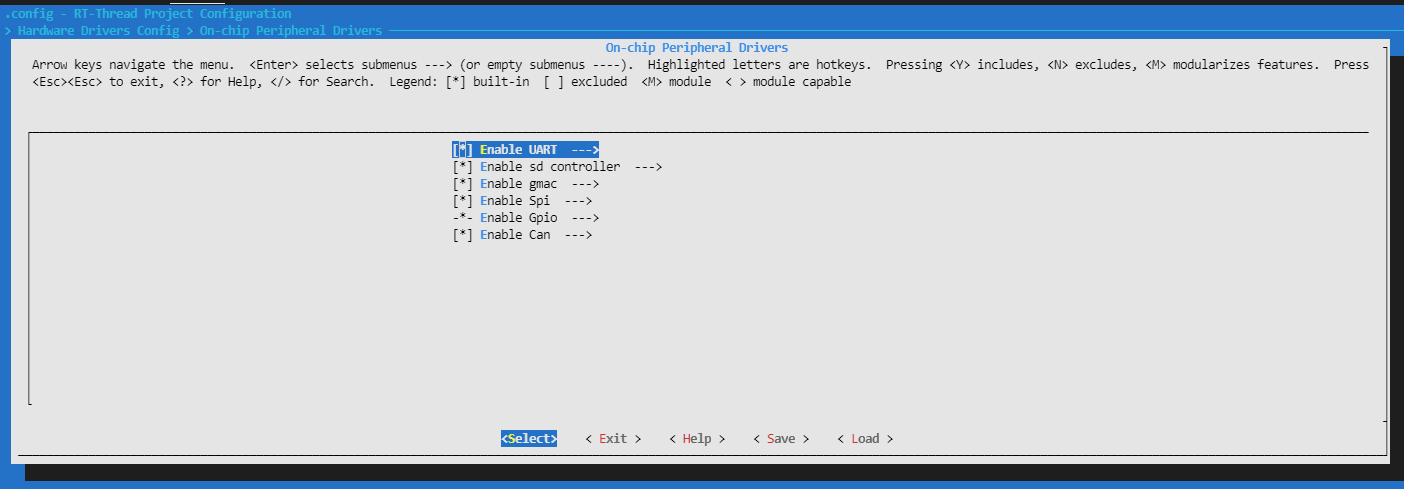 • 配置 rt-thread 的编译选项,打开 BSP_USE_SPI 和 BSP_USE_GPIO 配置,关闭 BSP_USE_QSPI 配置,打开 rt-thread 的 SFUD 调试开关